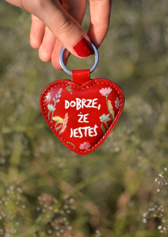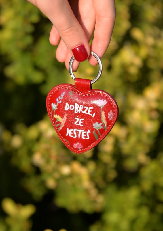 Ręcznie malowany skórzany breloczek z napisem „Dobrze, że jesteś” po jednej stronie i gładką powierzchnią po drugiej