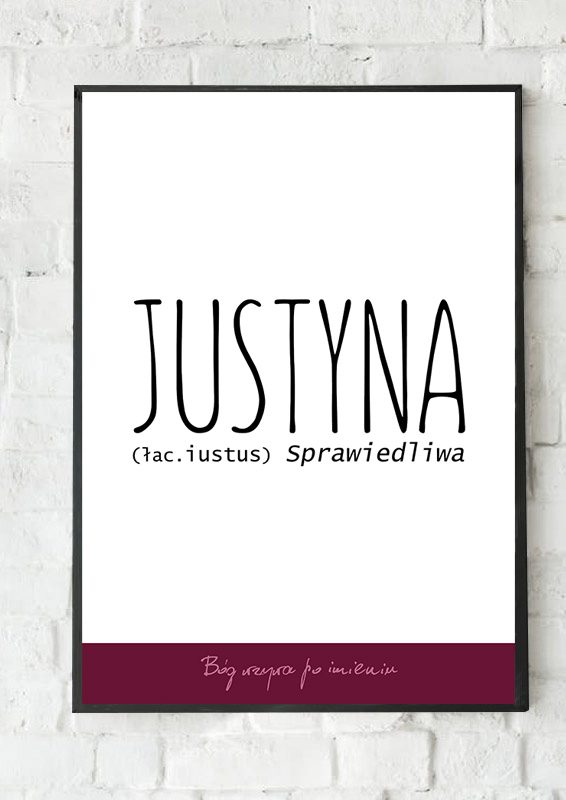 Imię żeńskie pochodzące od imienia męskiego JUSTYN, które to imię pochodzi z j. łacińskiego, od „iustus” – sprawiedliwy.