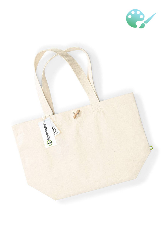 Ręcznie malowana torba na zakupy z płaskim dnem zapinana na guzik z drewna. Płaskie dno zwiększa pojemność i ułatwia pakowanie. Dwa długie uchwyty z plecionej taśmy bawełnianej nadaje się do noszenia torby zarówno w ręku, jak i na ramieniu. Druga strona torby gładka bez malunku.